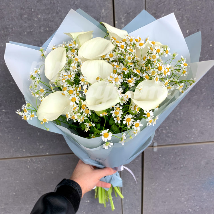 Букет из белых калл и ромашек