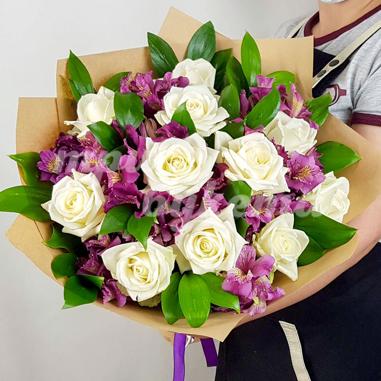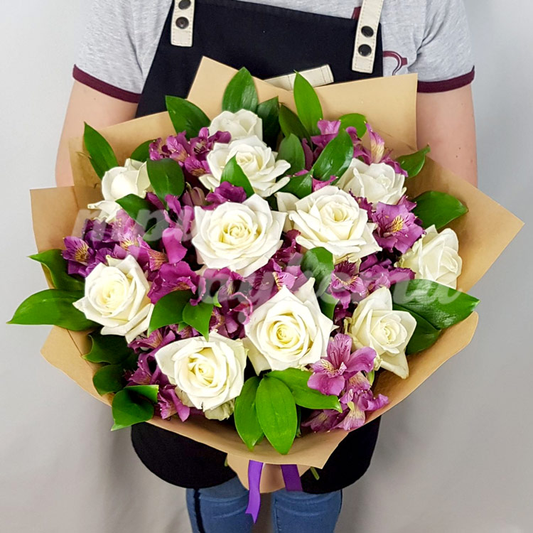 Букет из белых роз и альстромерий