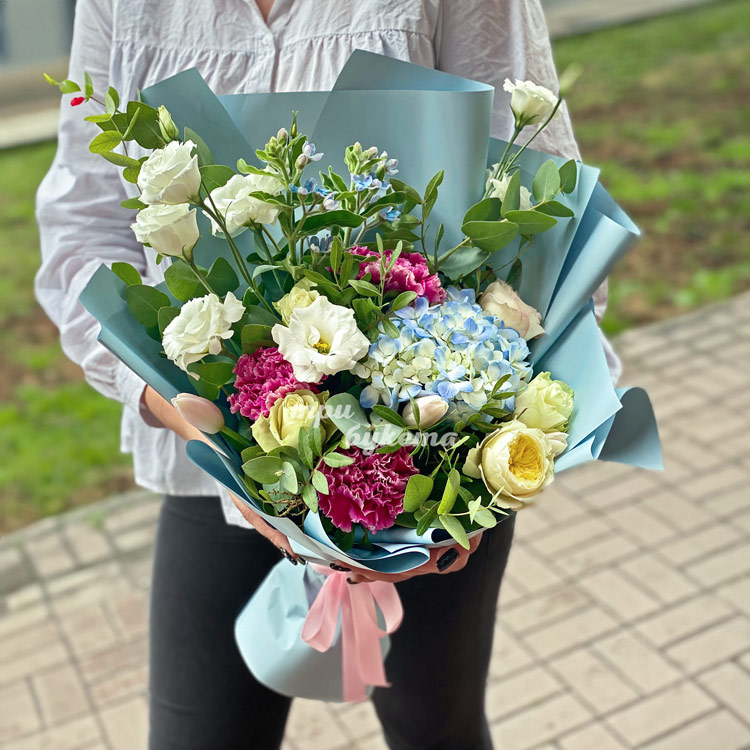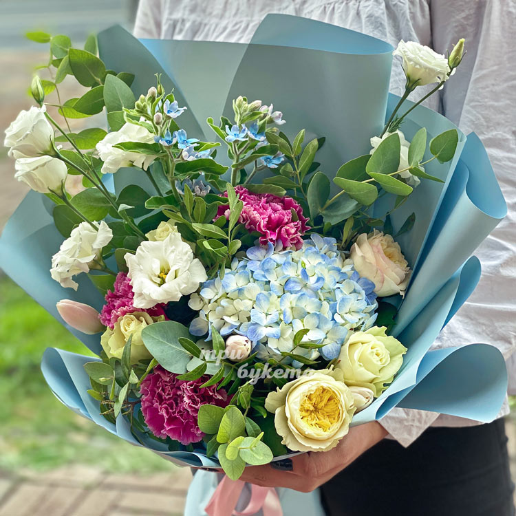 Букет из гортензии, гвоздик и роз