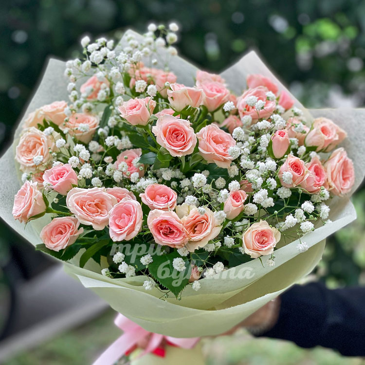 Букет кустовых роз с гипсофилой