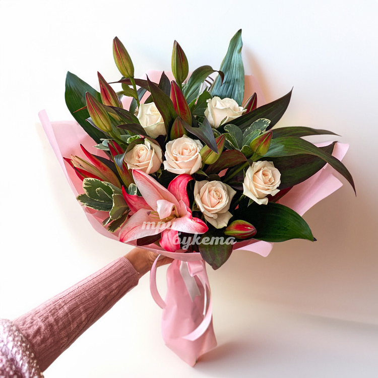 Букет розовых лилий и кремовых роз