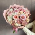 Букет розовых маттиол и кремовых роз