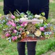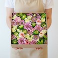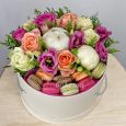 Фрезии и розы с макарунами в коробке