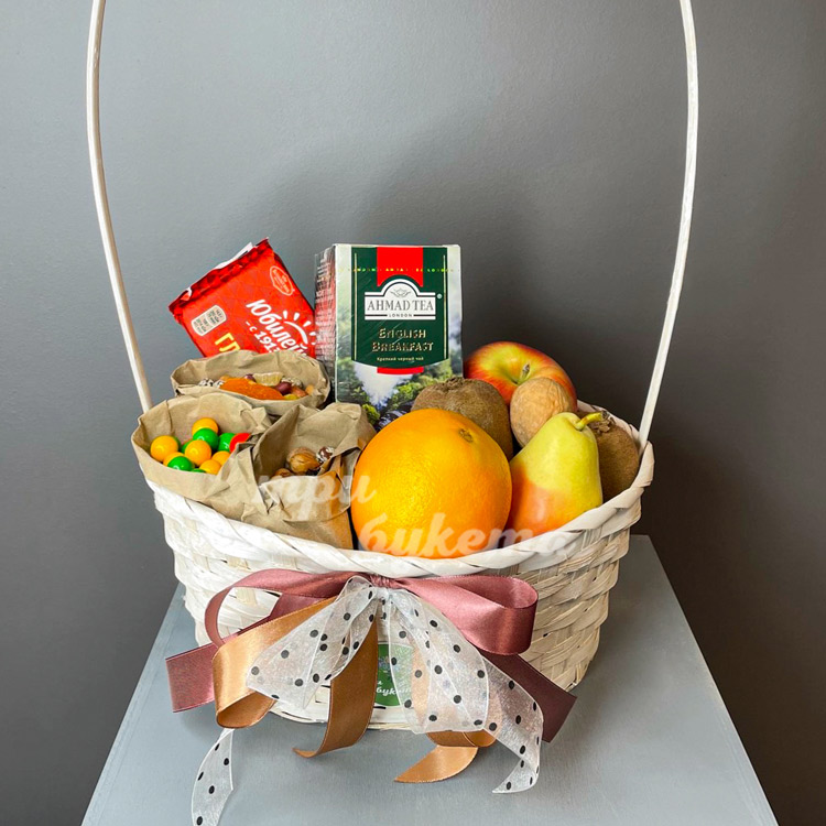 Корзина с фруктами, чаем и орешками