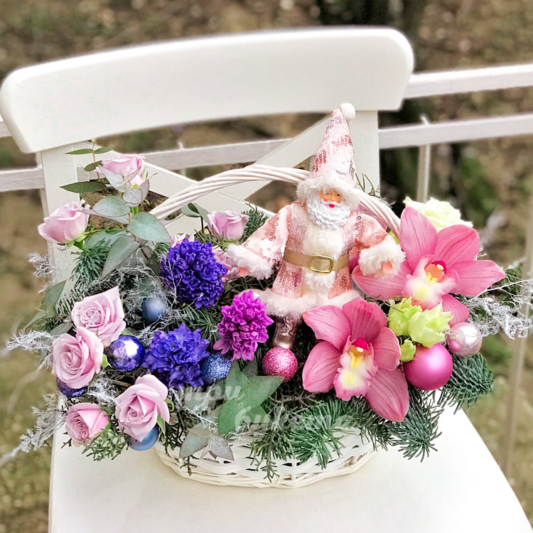Новогодняя корзина цветов с шарами