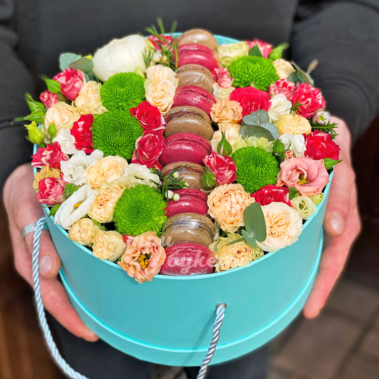 Персиковые пионовидные розы с 10 макарунами