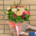 Пурпурные розы с гиперикумом в коробке