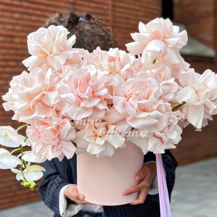 Шляпная коробка кремовых роз с орхидеями