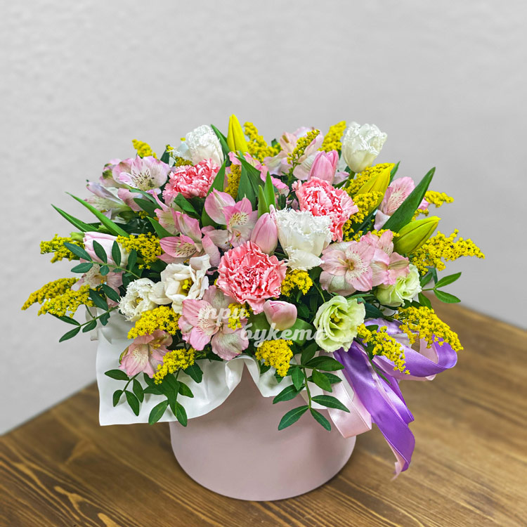 Тюльпаны, гвоздики и альстромерии в коробке