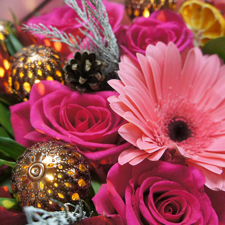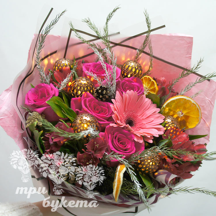 Зимний букет из цветов и гирлянды